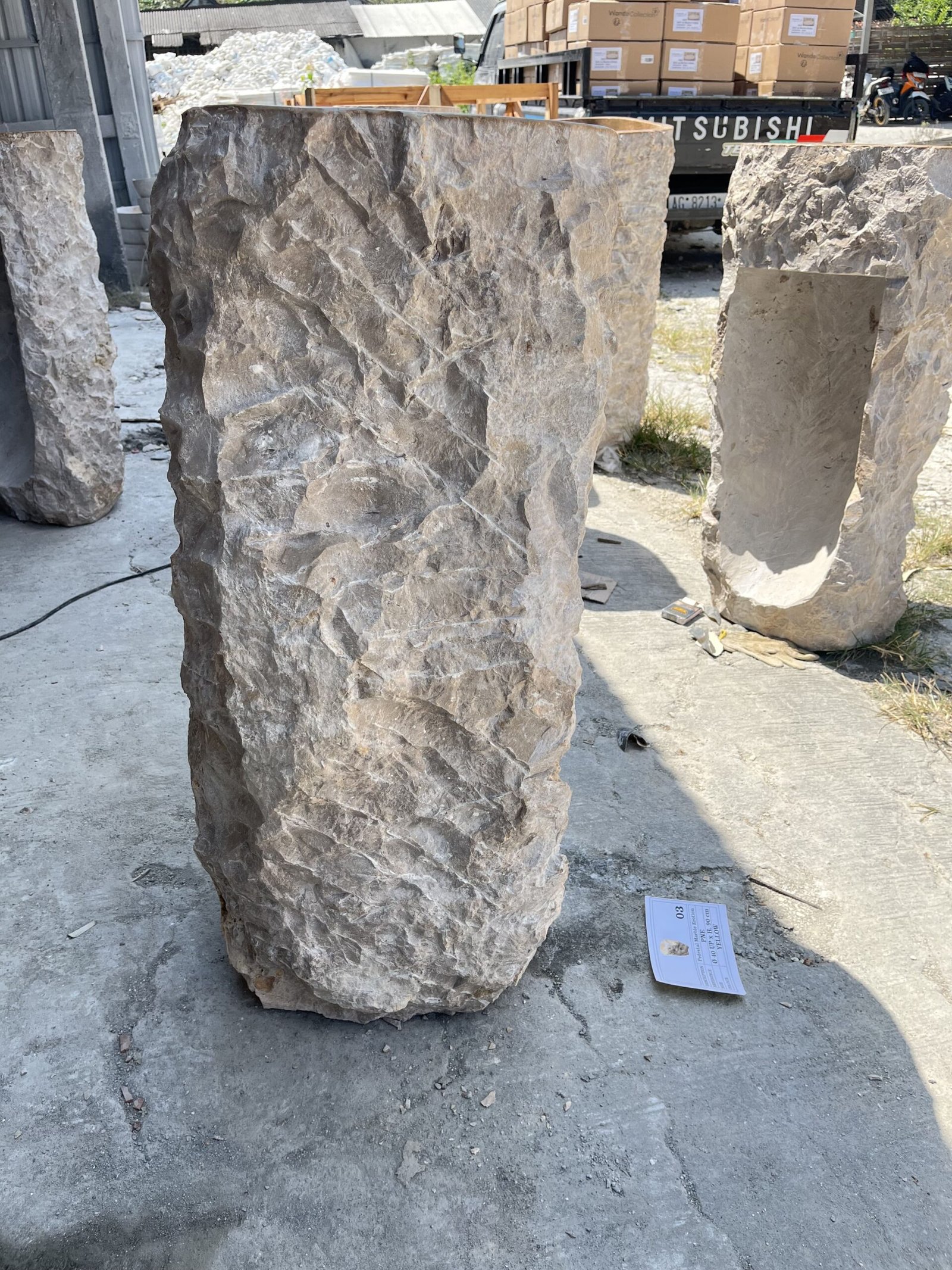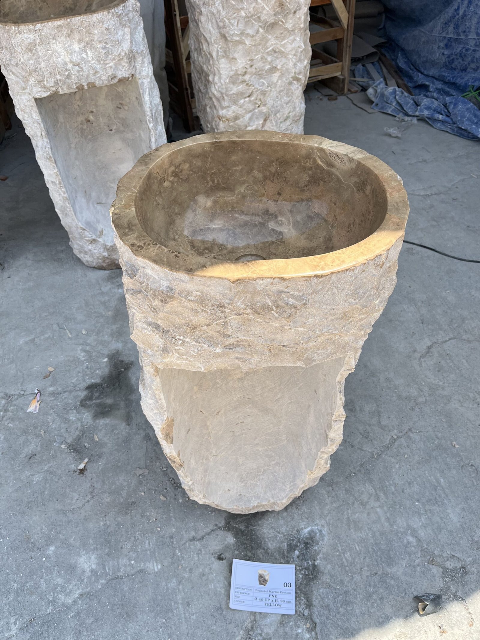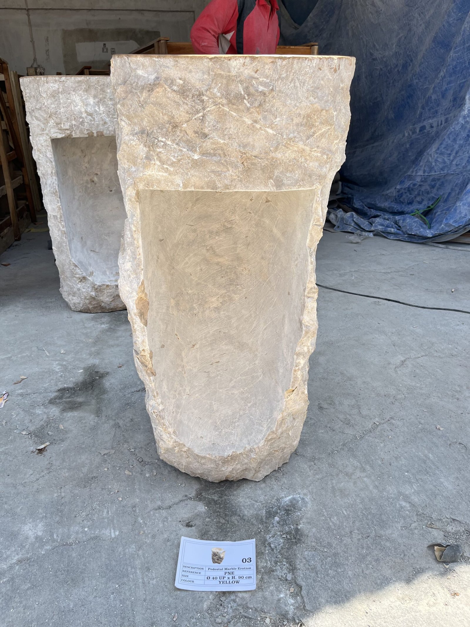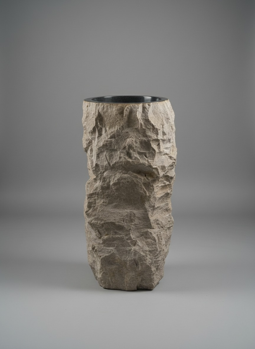 Elaborado a partir de una única pieza de piedra erosionada tallada a mano, esta bacha pedestal posee una forma única y hermosa.
