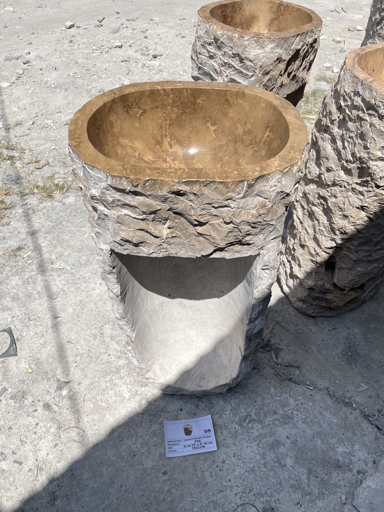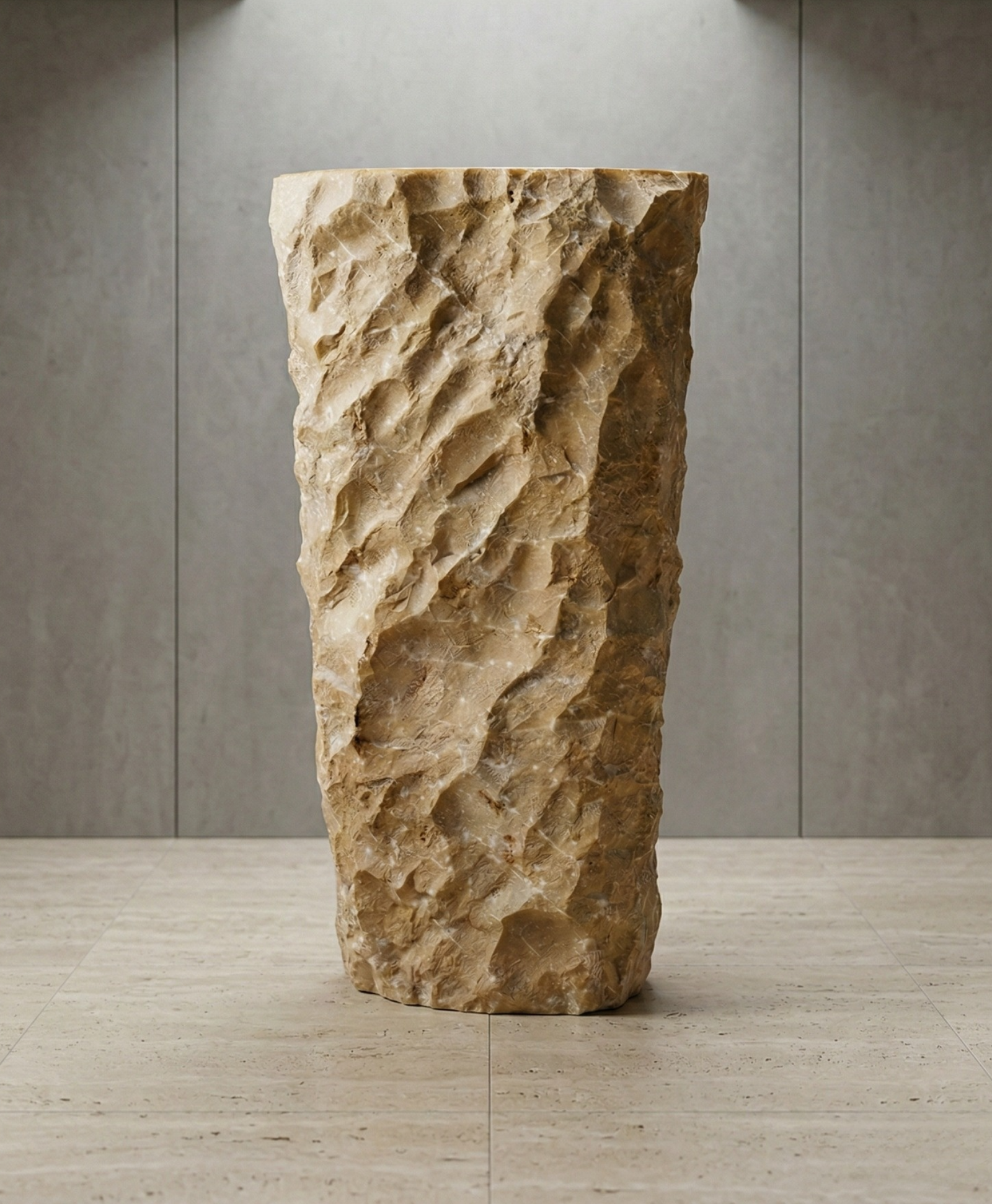 Elaborado a partir de una única pieza de piedra erosionada tallada a mano, esta bacha pedestal posee una forma única y hermosa.