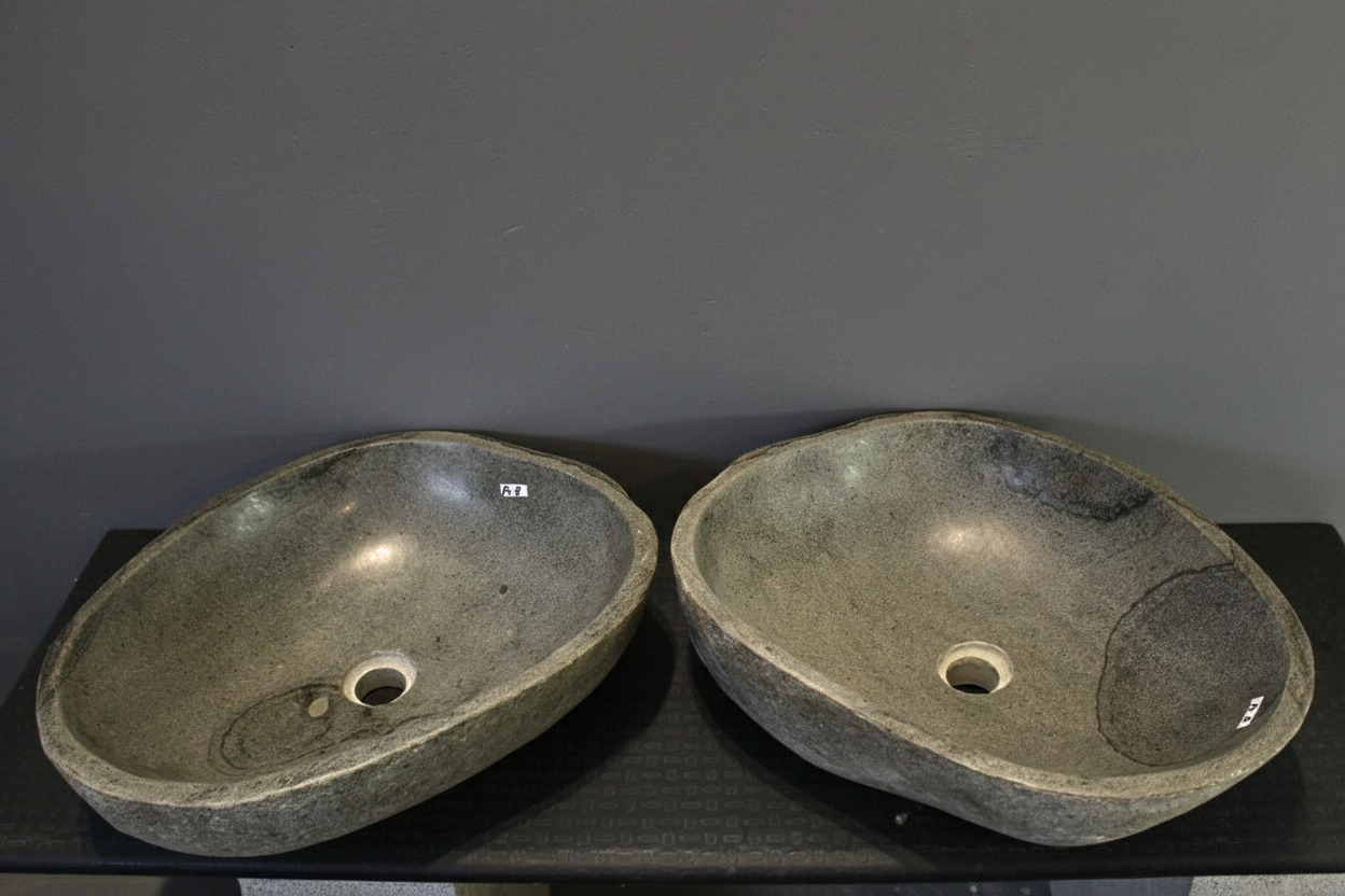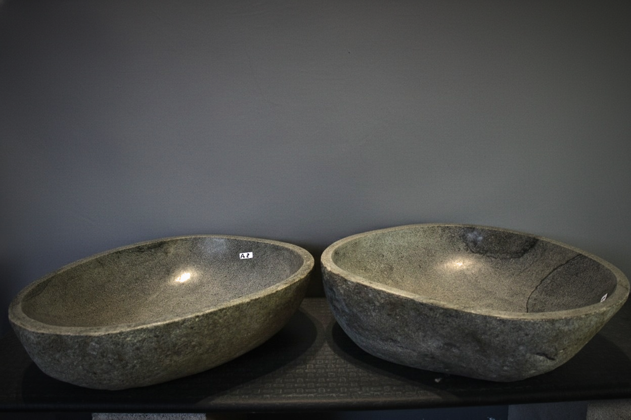 Set de 2 Bachas gemelas hechas de la misma piedra natural de río . Acabado con interior pulido y manteniendo el aspecto natural de las diferentes tonalidades en el exterior.