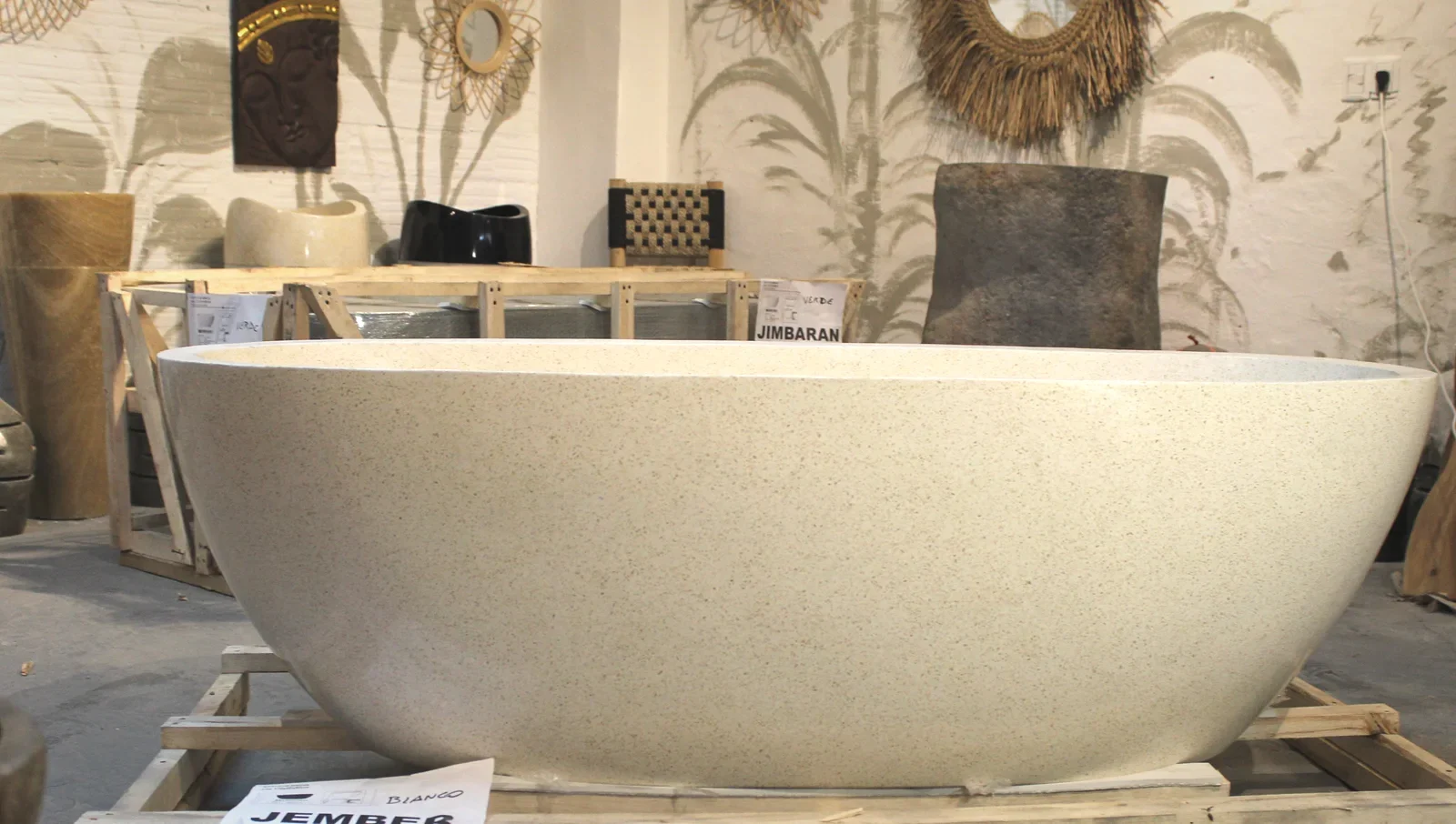 Bañeras Terrazo realizada con materiales más nobles , suaves y a su vez robustos provenientes de una mezcla de polvo de mármol, piedra y calcio de la región de la isla de Bali.  Este mix de materiales son ideales para conservar la temperatura original, manteniéndose caliente durante los días mas frio del invierno y fresca los días más calurosos del año . Su peso estimado es de 250kgs, otorgando con la colocación adecuada, una durabilidad de por vida.
